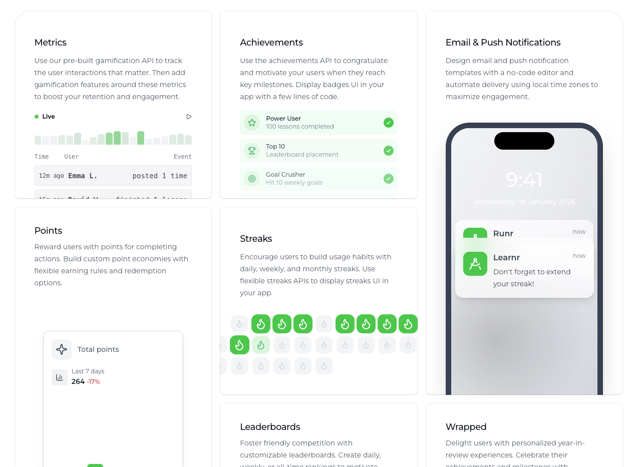 Trophy's solution: Gamification features like streaks, leaderboards, XP and achievements out of the box.