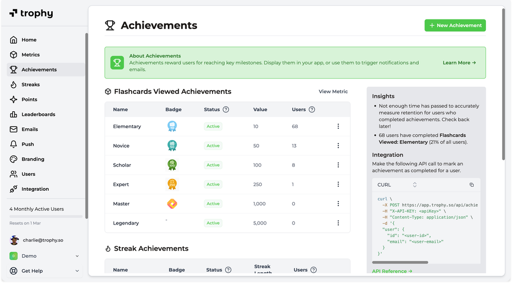 Achievements work on metric thresholds or API triggers. Track any event, set conditions for when achievements unlock, and Trophy handles the progress tracking and notifications.