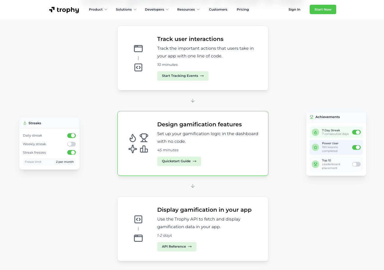 Trophy is API-first infrastructure. SDKs that your engineering team integrates directly. You build the UI, Trophy handles the backend for gamification features like streaks, achievements, leaderboards, and points. Ship in hours if you know what you're building.