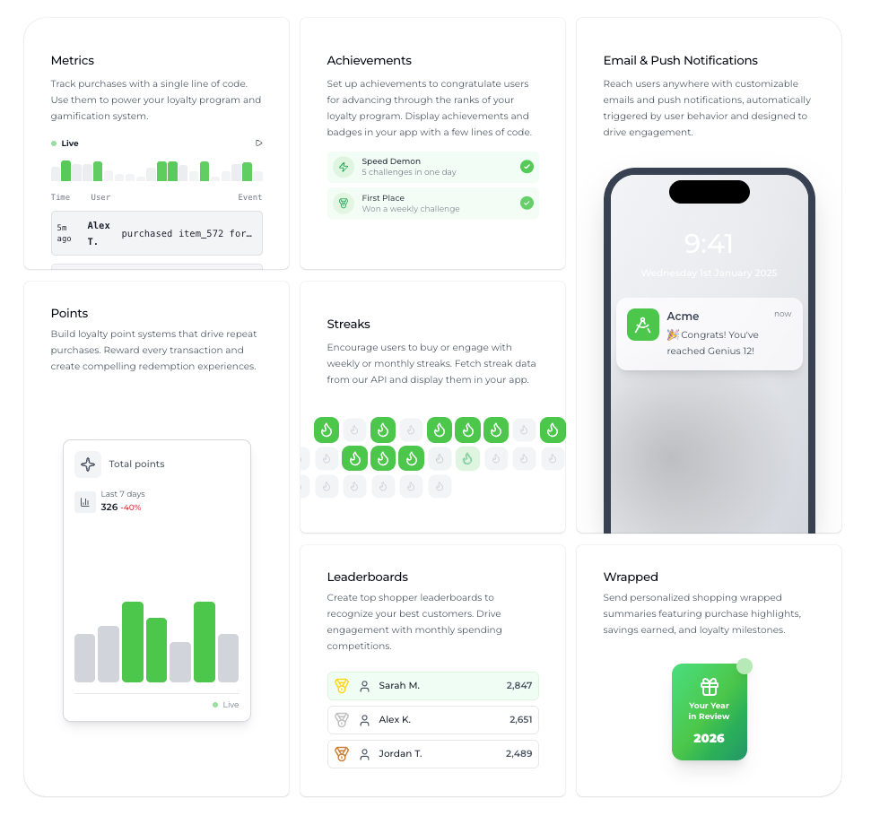 Trophy is focused gamification infrastructure. Streaks, achievements, and leaderboards built as native product features. Best for apps where gamification drives engagement and habits, not just transactions, and for fast-moving product teams.