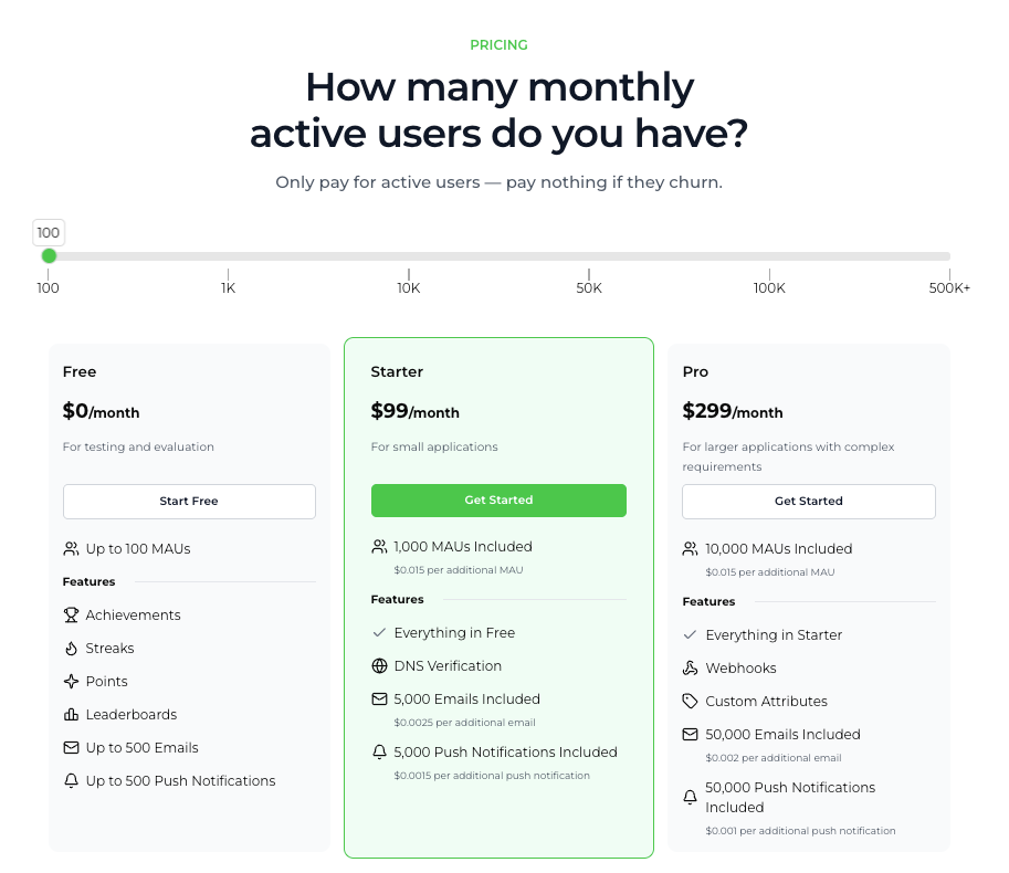 Quote-based and enterprise-focused. You need 500k coupons minimum just to qualify for the Starter tier. Trophy is free up to 100 MAU, then switches to usage-based pricing — a much lower barrier to entry for a gamification API.